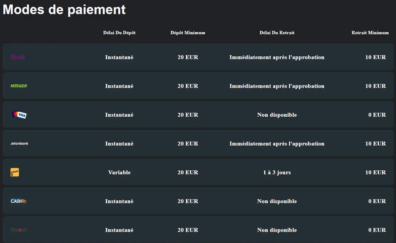 Pour vos dépôts et retraits en France, nous disposons de plusieurs méthodes de paiement accessibles à tous nos joueurs. En effet, nous avons tous types de paiement (e-wallets, cartes bancaires, crypto-monnaies et virements bancaires). Chaque type de paiement dispose de ses propres caractéristiques et informations. Le dépôt minimum autorisé sur notre interface mobile est de 10€. Quant au retrait maximum, il est de plusieurs milliers d’euros. Il faut souligner que nous n’appliquons aucuns frais lors de vos transactions sur notre plateforme. Nos méthodes de paiement sont les suivantes: