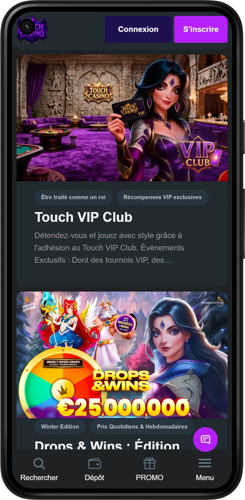 Dès que nous ouvrons la Touch casino app, nous arrivons sur une page d’accueil qui met en avant :