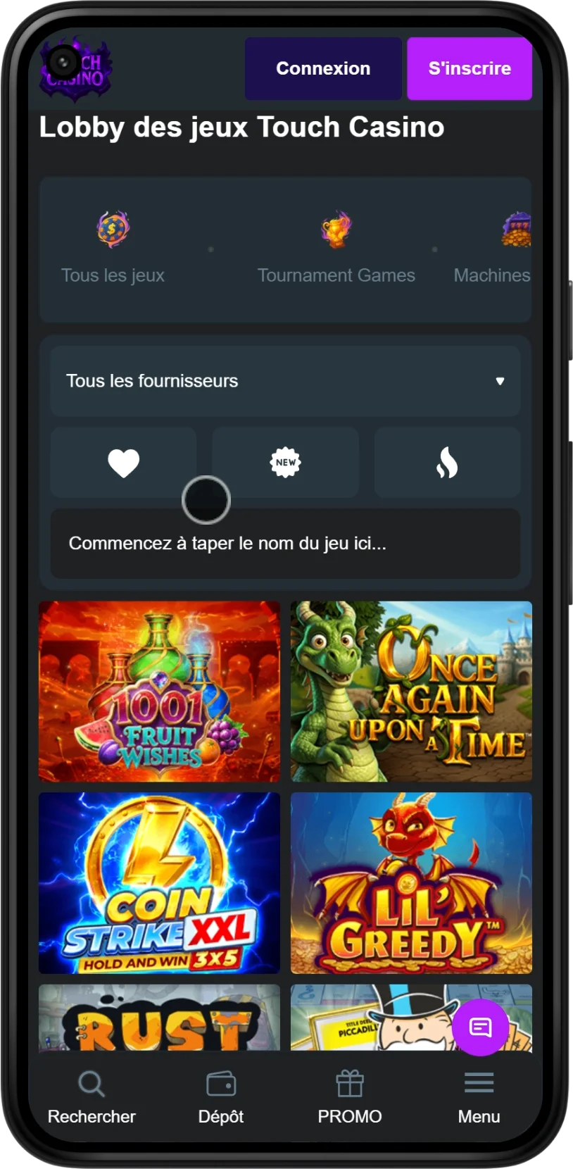 Notre section Touch Casino Slots en ligne est pensée pour être simple à parcourir, avec des filtres utiles et des catégories qui aident à trouver rapidement le bon style de jeu.